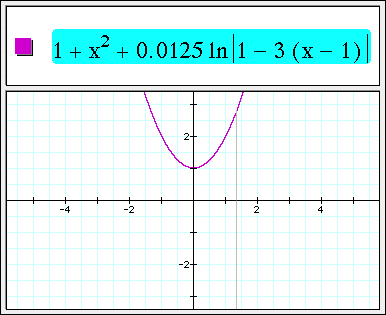 Graphing Calculator uses interval arithmetic to graph functions robustly. In this example, the gray line represents a narrow valley where the function diverges to negative infinity. Graphing Calculator identifies this feature, even though it is narrower than a pixel.